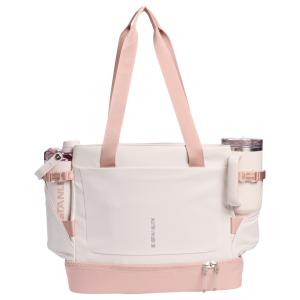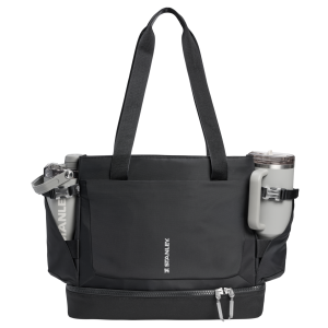 The Vitalizeā„¢ Tote carries it all. Outside. the Tumbler Securing Belt and Pocket holds your 40-ounce QuencherĀ® ProTour or Vitalizeā„¢ Shaker with easy access. A front zip pocket holds your phone. keys and wallet. Inside. the zippered main compartment has space for a jacket or change of clothes. and a sleeve for your laptop. The zippered. multi-function bottom compartment grows upward to hold food containers. shoes. post-workout clothes and more. Grab the carry straps or toss it over your shoulder and get started.